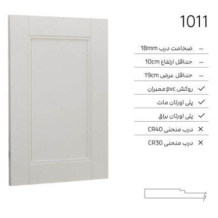 ✓ ضخامت درب 18mm ✓ حداقل ارتفاع 11cm ✓ حداقل عرض 22cm ✓ روكش PVC ممبران ✓ پلى اورتان مات
