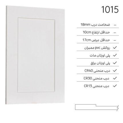 ✓ ضخامت درب 18mm ✓ حداقل ارتفاع 10cm ✓ حداقل عرض 15cm ✓ روكش PVC ممبران ✓ پلى اورتان مات
