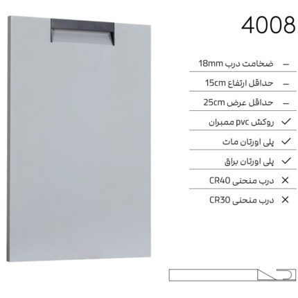 ✓ ضخامت درب 18mm ✓ حداقل ارتفاع 10cm ✓ حداقل عرض 15cm ✓ روكش PVC ممبران ✓ پلى اورتان مات